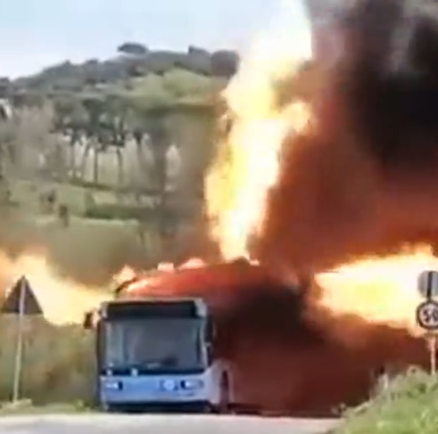 改造車なのか事故なのか、猛烈な火を噴いているバスの映像です。燃料系統とはあまり関係ない車体上部後方から火を噴いています。どう考えてもこれを放置したら大爆発するでしょww